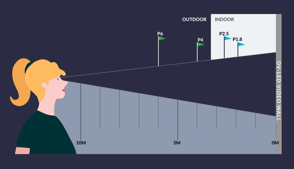 One factor to consider when planning your DV-LED project is viewing distance and how pixel pitch plays a part in this. Pixel pitch refers to the distance between each LED/pixel, so in a P6 DV-LED Video Wall there would be 6mm between each pixel, both horizontally and vertically. This is why typically indoor DV-LED solutions have lower pixel pitches when compared to outdoor DV-LED solutions as you would expect outdoor displays to be viewed from a further distance. When deciding which pixel pitch is right for you, a general rule of thumb is the number after the “P” dictates the optimum viewing distance in meters. For example, the optimum viewing distance for a P6 DV-LED display is 6 meters or more.
