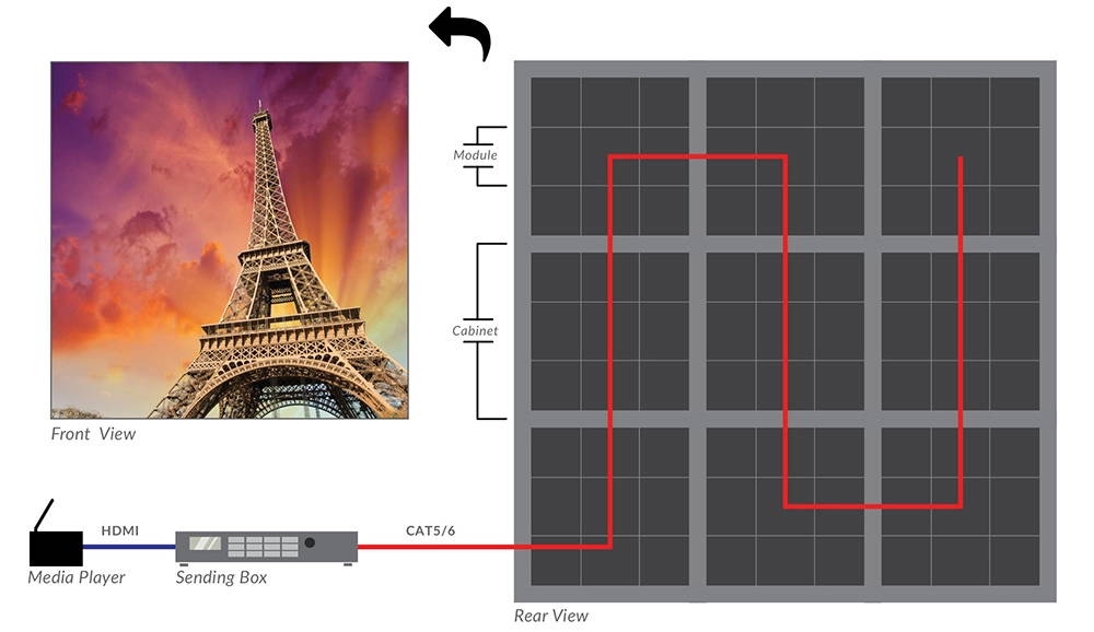 An Direct View LED solution is made up of several components. The first of which is the media player, which sends the content via HDMI to the sending box. The sending box processes this video signal and sends it to the receiving card of the first LED cabinet. Each cabinet, which is comprised of separate LED modules, is then daisy chained to one another using a CAT5 cable to carry this signal.