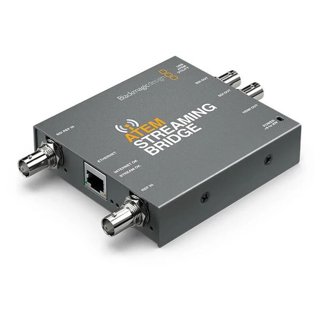 The ATEM Streaming Bridge is a video converter that lets you receive a H.264 stream from any ATEM Mini Pro, ATEM Mini Extreme, or ATEM SDI Extreme models and convert it back to SDI and HDMI video. This means you can send video to remote locations around your local Ethernet network, or via the internet globally.