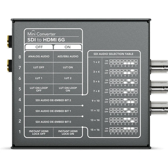 Mini Converter SDI to HDMI 6G lets you convert from SDI to HDMI in SD, HD, and Ultra HD formats while de-embeding audio to HDMI, AES/EBU or balanced analog audio. You also get advanced features such as down conversion for monitoring Ultra HD on HD HDMI monitors as well as built in 3D LUTs plus HDMI instant lock for instant video display when an SDI input is connected!