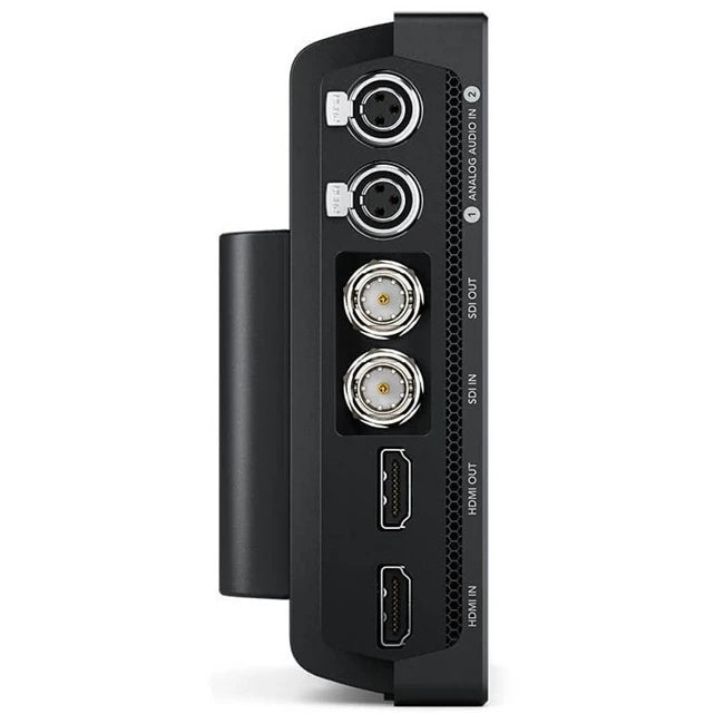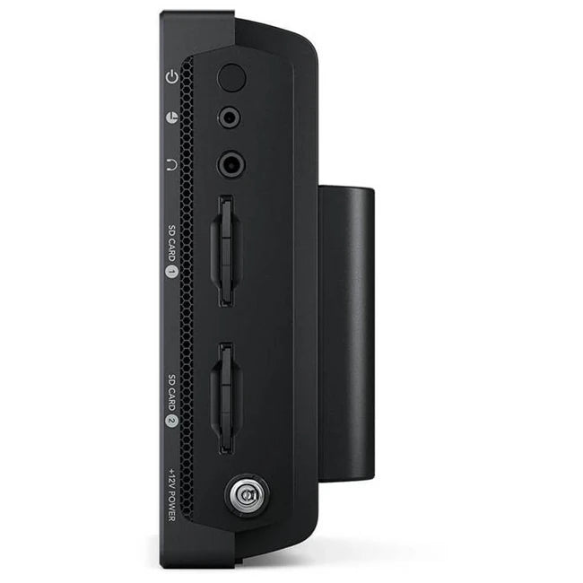 Feature Description Connections SDI Video Inputs 1x 12G-SDI SDI Video Outputs 1x 12G-SDI HDMI Video Inputs 1x HDMI 2.0a HDMI Video Outputs 1x HDMI 2.0a Analog Audio Inputs 2x Balanced Mini XLR with Phantom Power Analog Audio Outputs 1x 3.5mm Headphone Jack Built-in Speaker Mono Screen 7 inch 1920 x 1200, 2500 nits brightness, P3 wide color gamut SDI Audio Inputs 16 channels embedded via 12G-SDI SDI Audio Outputs 16 channels embedded via 12G-SDI HDMI Audio Inputs 8 channels embedded via HDMI 2.0a HDMI Audio Outputs 8 channels embedded via HDMI 2.0a Remote Control 1x 2.5mm LANC for Record Start/Stop SD Interface Dual UHS-II SD slots Storage Type Removable SDXC UHS-II, SDXC UHS-I and SDHC UHS-I SD cards Computer Interface 1x USB Type-C 3.1 Gen 1 for external drive recording, webcam out, software updates & control Standards SDI Video Standards NTSC/PAL, 720p, 1080p, 1080i, 2Kp, Ultra HD, 4K DCI (various frame rates) SDI Compliance Various industry standards Audio Sampling 48 kHz, 24-bit Video Sampling 4:2:2 YUV Color Precision 10-bit Color Space REC 601, REC 709, REC 2020 HDR Support HDR10, Hybrid Log Gamma HDMI Video Standards Same as SDI standards HDMI Color Precision 10-bit Media 2x UHS-II SD slots, USB Type-C for external drive recording Supported Codecs Extensive list including Blackmagic RAW and various Apple ProRes, DNxHR formats Control Recorder Control Touchscreen LCD with on-screen controls External Control LANC, SDI and HDMI start/stop and timecode run Blackmagic RAW Records from various supported cameras (see table) Software Blackmagic OS included Scopes Waveform, RGB Parade, Vector, RGB Histogram Viewing Modes Scopes with picture in picture or overlay, Waveform and Parade with standard and HDR graticules Operating Systems Mac 10.14 Mojave or later, Windows 8.1 and 10 Power Requirements Power Supply External 12V power supply (compatible with Sony NP-F batteries, not included) Physical Specifications Operating Temperature 0° to 40° C (32° to 104° F) Storage Temperature -20° to 45° C (-4° to 113° F) Relative Humidity 0% to 90% non-condensing Warranty 12 Month Limited Manufacturer's Warranty