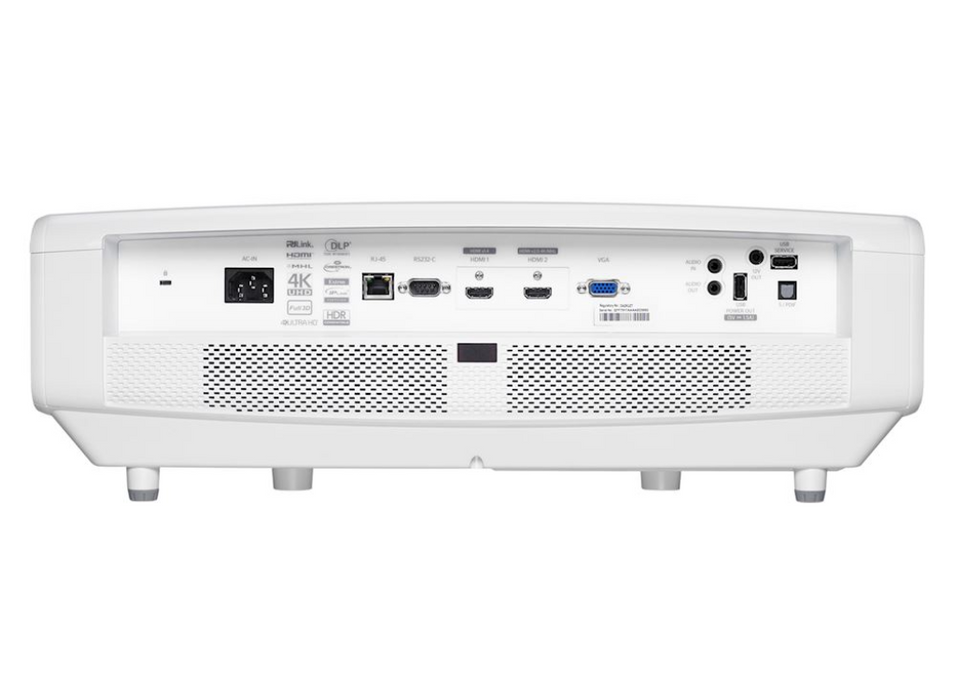 Category Detail Display/Image Display Technology DLP™ Resolution UHD (3840x2160) Brightness 5,000 lumens Contrast Ratio 2,000,000:1 Native Aspect Ratio 16:9 Aspect Ratio Compatible 4:3 Horizontal Scan Rate 31 ~ 135Khz Vertical Scan Rate 24 ~ 120Hz Uniformity 70% Screen Size 0.67m ~ 7.68m (26.45" ~ 302.2") diagonal Lamp Info Light Source Type Laser Laser Life 30,000 hours Optical Throw Ratio 1.39:1 ~ 2.22:1 Projection Distance 1.3m - 9.3m Zoom 1.6 Zoom Type Manual Focal Length 20.91mm~32.62mm/0.823"~1.284" Lens Shift Vertical +15% Native Offset 100% Connectivity Connections Inputs: 1 x HDMI 2.0, 1 x HDMI 1.4a (3D support + MHL), 1 x VGA (YPbPr/RGB), 1 x Audio 3.5mm, 1 x USB-A service; Outputs: 1 x Audio 3.5mm, 1 x S/PDIF, 1 x USB-A power 1.5A, 1 x 12V trigger; Control: 1 x RS232, 1 x RJ45 General Noise Level (Min) 29dB Noise Level (Max) 31dB PC Compatibility UHD, WQHD, WUXGA, etc. 2D Compatibility 480i/p, 576i/p, 720p, 1080i, 1080p, 2160p 3D Compatibility Side-by-Side, Frame-pack, Over-Under 3D Full 3D Security Security bar, Kensington Lock, Password interface OSD/Display Languages 9 languages Operating Conditions 5°C~40°C, max altitude 3000M, max humidity 85% Remote Control Backlit home remote Speaker Count 2 Watts per Speaker 4W In the Box AC power cord, Remote control, Batteries, Lens cap, Manual Input Lag 80.00ms Networking LAN - Control Yes Power Power Supply 100 ~ 240V, 50 ~ 60Hz Power Consumption (Standby) 0.5W Power Consumption (Min) 274W Power Consumption (Max) 368W Weight and Dimensions Dimensions 498 x 331 x 171 mm Gross Weight 12.38 kg Net Weight 10.52 kg -